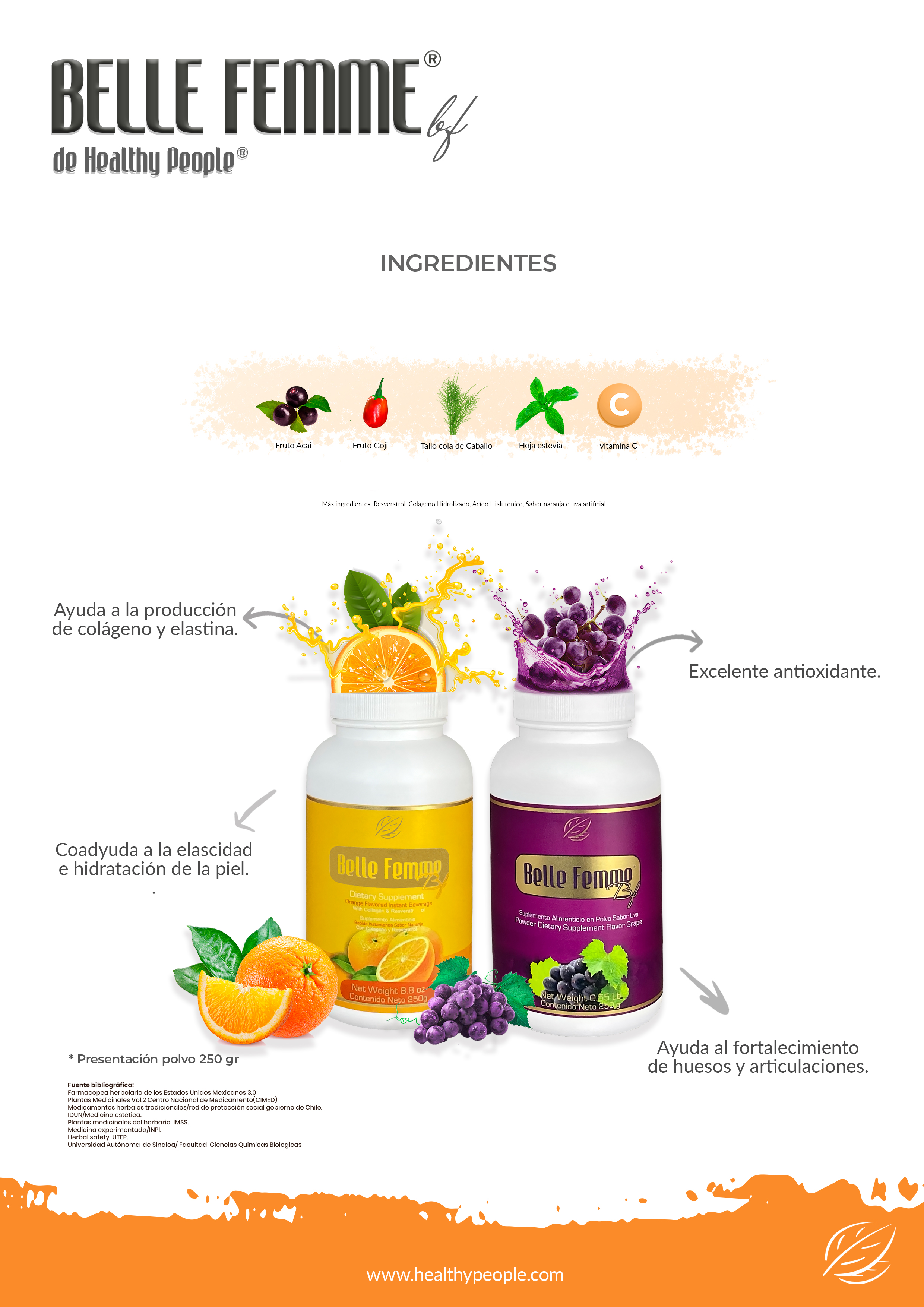 Belle Femme®, una de sus principales cualidades está en sus microscópicas partículas, que el organismo absorbe rápida y fácilmente, distribuyéndose por todo el flujo sanguíneo, aprovechando así al 100% sus beneficios. Restaurando el organismo y dándole en cada toma, un torrente de vida a nuestro cuerpo.